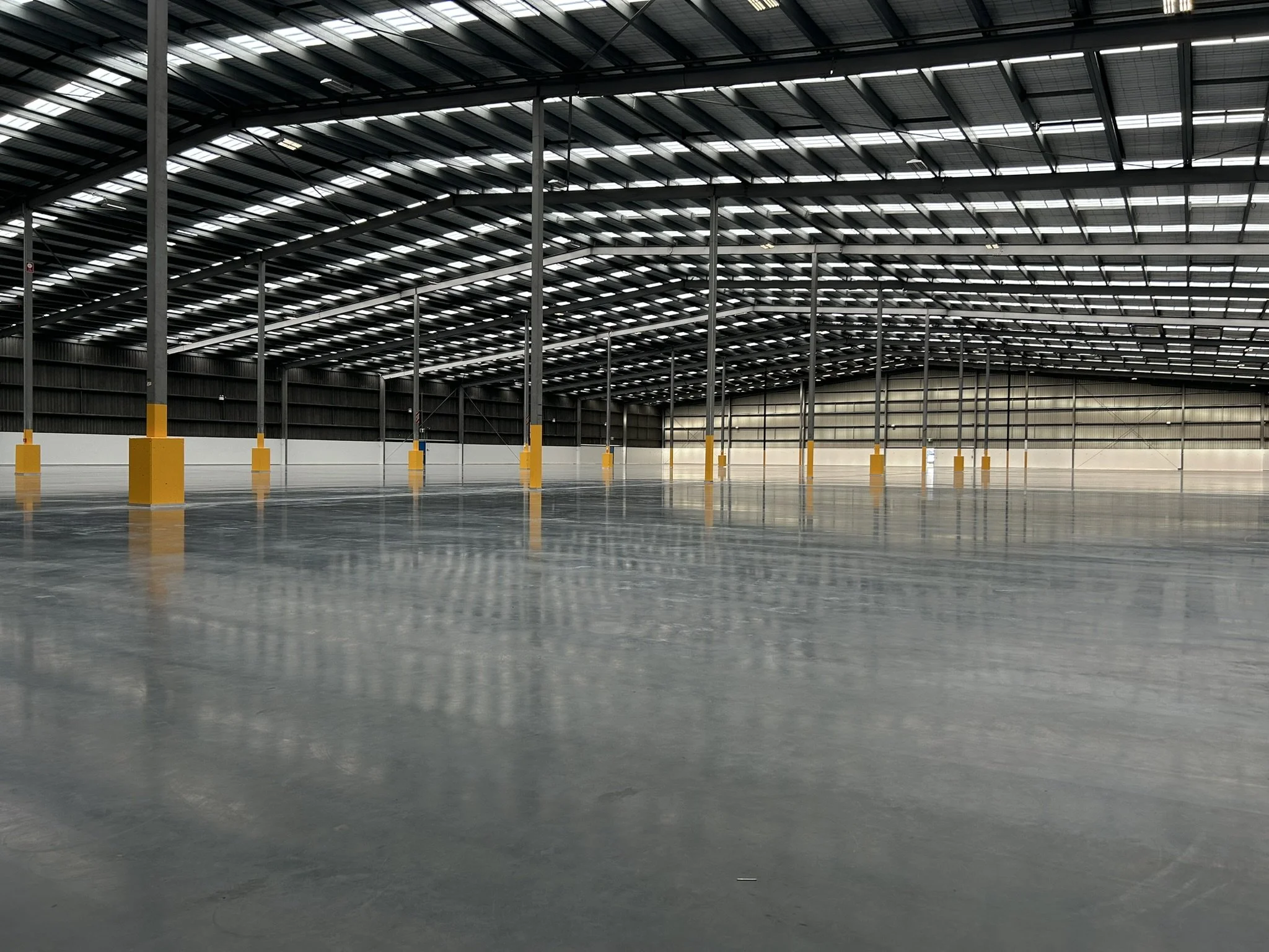 The finished product is a 6,700m² unbonded fibre-reinforced topping slab constructed in just 3 weeks. Surface regularity of FM1 was achieved (FM2 specified), which was independently verified by third-party consultants. We utilised Lower-carbon concrete from , with a 35% reduction in embodied carbon compared to ISC baseline, and achieved a very high-quality burnished finish with minimal visible fibres